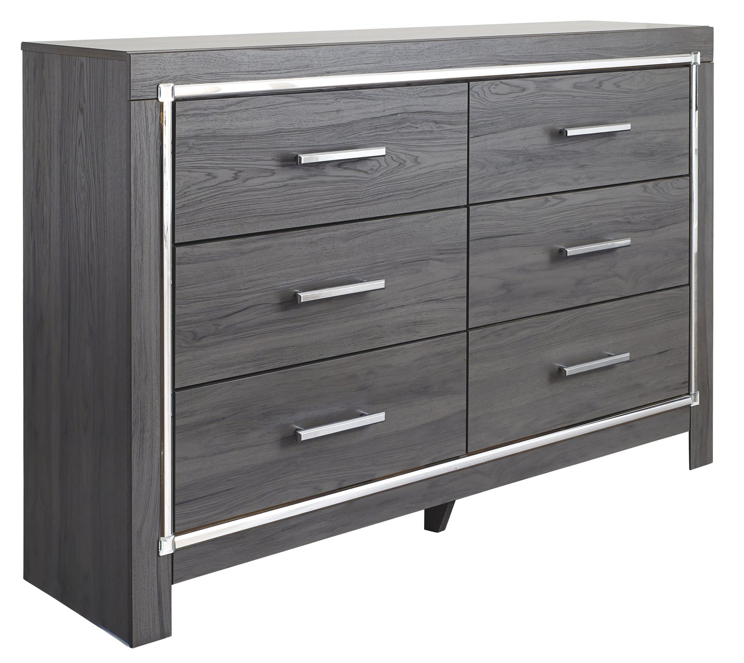 Reminiscent of Hollywood glamour of yesteryear, this bedroom set interprets luxury in a decidedly modern way. Sumptuous details include button-tufted upholstery, faceted faux crystals and chrome-tone accents beautifully lit by LED lights enhanced with remote-controlled settings for color and brightness. Modern gray finish with replicated wood grain. Cases and bed are accented with faceted chrome details. Large scaled chrome handle with faceted details. Headboards are accented with LED lighting and include a remote for color and brightness options. Included remote holder discreetly keeps light remote accessible. Headboards are accented with faux crystal tufted black upholstery. Side roller glides for smooth operating drawers. Drawer interiors are lined with a faux linen laminate for a clean finished look.