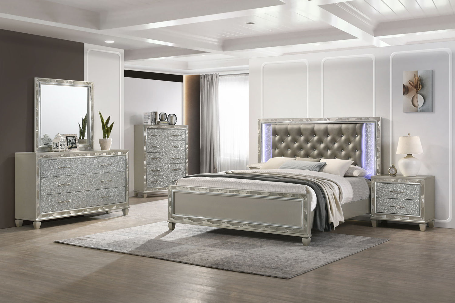 Discover the Radiance Bedroom Set, meticulously crafted to offer unparalleled stability and durability from a combination of Solid Rubberwood and manufactured woods. Its semi-gloss lacquer finish lends a silky, modern touch to this captivating collection. Glossy textured inlays, mylar trim, and crushed crystal decorative laminates are seamlessly incorporated throughout, creating an opulent appeal. Indulge in relaxation with the crystal-studded, button-tufted headboard, providing a sumptuous spot for lounging with a good book. The 6 Drawer Dresser and 5 Drawer Chest feature heirloom quality English dovetail drawer assembly and smooth full-extension drawer glides for effortless operation. Finished interiors and top drawers lined with felt ensure snag-free storage. Immerse yourself in a soothing ambiance with the soft blue LED lighting in the headboard and mirror, controlled by a touch switch. Transform your bedroom into a haven of luxury and comfort with the Radiance Queen Bedroom Set.