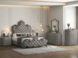 The Perine Collection is luxuriously designed and upholstered in sumptuous gray velvet and features black piping. The hardwood wooden frame is designed for long-lasting enjoyment. The crown design on the headboard and footboard adds some drama to the bed. Glistening crystal-like button tufting is carried out through the piece for a regal look. This magnificent bed conveys a majesty that you can feel throughout the home.