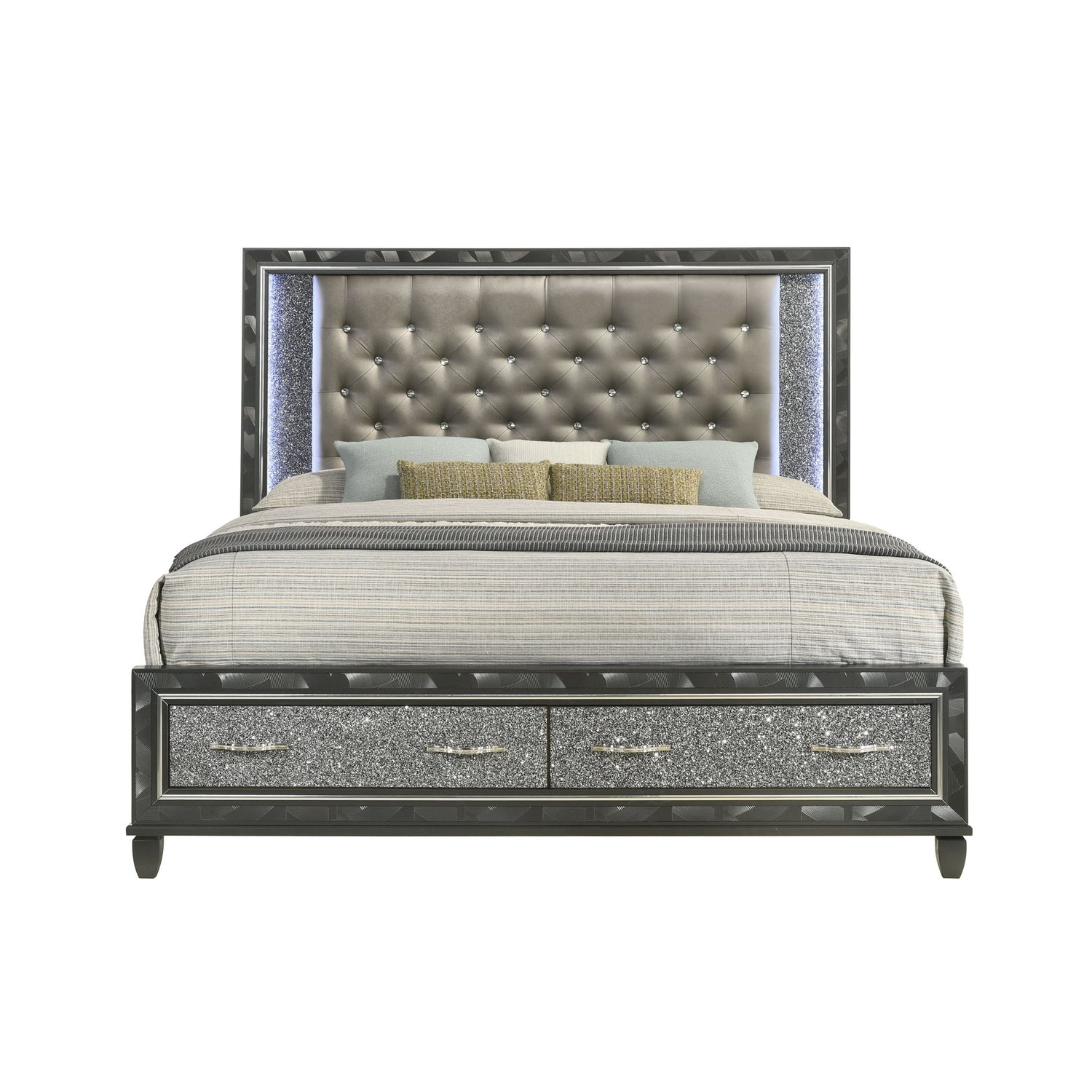 Indulge in the allure of the Radiance Storage Bed, a marvel of quality construction crafted from a blend of solid rubberwood and manufactured woods for unparalleled stability and durability. Its semi-gloss lacquer finish lends a silky, modern touch to this captivating piece. With glossy textured inlays, mylar trim, and a crushed crystal look decorative laminate framing the plushly upholstered, crystal button-tufted headboard, this bed exudes opulence. LED lighting accents your space, sparkling against the glamorous padded headboard, while two footboard storage drawers offer the perfect spot for extra blankets and pillows. Elevate your bedroom with the Radiance Storage Bed, where luxury meets functionality.
