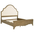 This French Provincial-inspired bed blends timeless elegance with modern craftsmanship. The arched headboard features an ecru fabric upholstered panel, framed by a gracefully curved solid poplar and engineered wood structure. A washed mango veneer finish enhances the natural grain, complementing the scalloped detailing on the footboard. Built with sturdy materials, this bed offers durability and refined style for a sophisticated bedroom setting.