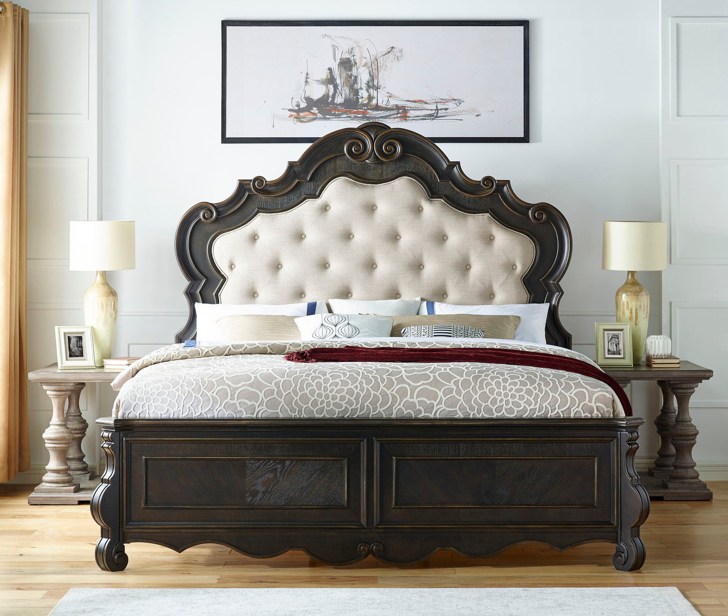 The Rhapsody Panel Bed presents a comfortable yet opulent, traditional style that will be the highlight of your bedroom. This majestic bed features an elaborately shaped headboard with a button tufted, beige fabric inset. The low footboard is accented by two panels with V-matched veneers and shapely, fluted pilasters, apron and scrolling feet. The rich molasses finish features edge rub-through to create the look of a time-worn beloved heirloom antique.