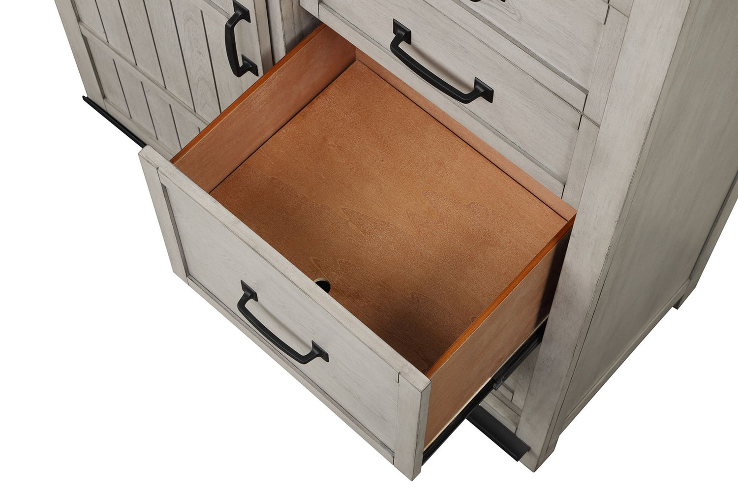 The Alexandria Wardrobe Chest from Bridgevine Home delivers a Modern Farmhouse-Industrial-Rustic style trifecta. Skillfully crafted from Poplar Solids and Birch Veneers, this Chest is finished in Mountain Mist with Forged Iron rivets and hardware. Featuring five drawers and one sliding barn door, this chest will provide ample storage for clothing and jewelry and make a stylish addition to your main or spare bedroom. Fully Assembled upon arrival, this piece from Bridgevine Home is ready to unbox and enjoy.
