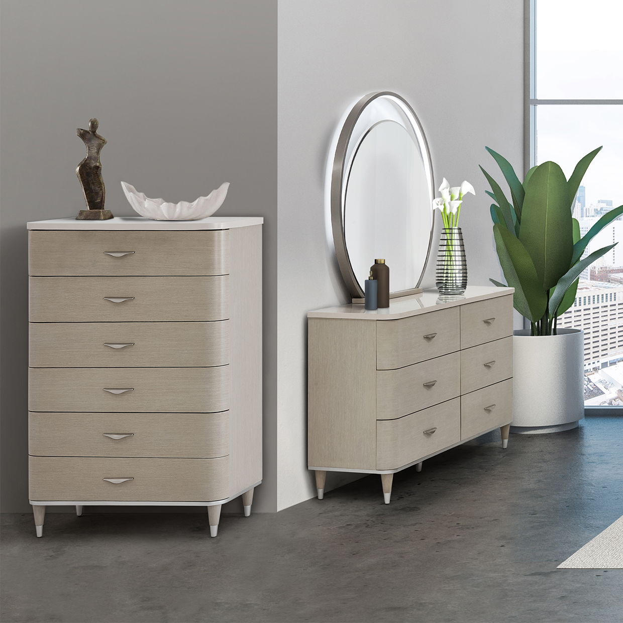 Design your home with the best! The Eclipse Chest is all about curving corners and smooth wood grain, with velvet lined drawers and a modern silhouette.