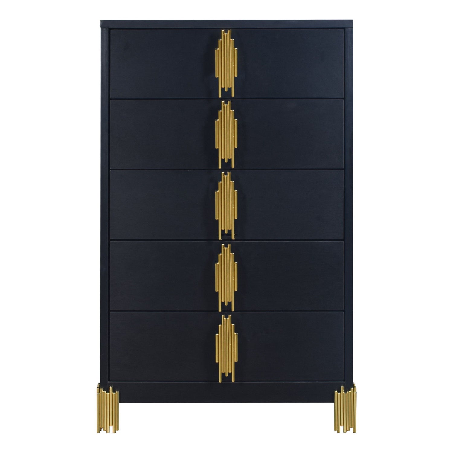 introducing the Empire 5 Drawer Chest in sleek black, a chic storage solution for your bedroom. Crafted with durable eco-friendly materials and a sophisticated finish, this chest exudes contemporary elegance. Its gleaming gold tiered drawer pulls and feet evoke the enchanting allure of a city skyline at night, adding a touch of glamour to your space. Inside, the drawers are meticulously crafted with English dovetail joinery and ball bearing glides, ensuring smooth and reliable operation. Enhance your bedroom with the Empire 5 Drawer Chest, where beauty meets quality for a truly captivating ambiance.