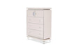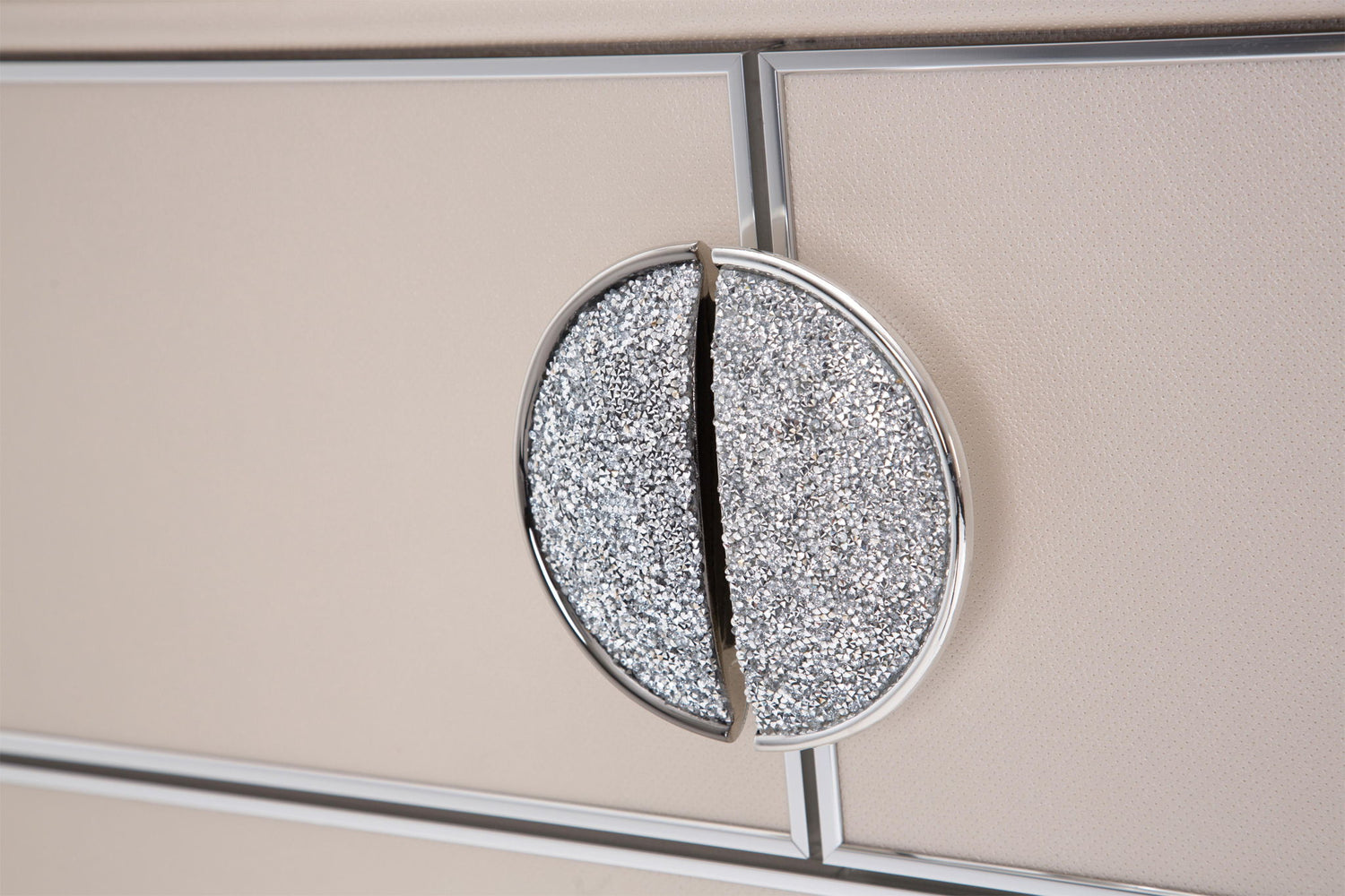 The 5-drawer chest features a stainless steel medallion as the focal design element, with crushed crystallized facets. Drawers are framed with stainless steel and the piece is fully upholstered with high quality textured vinyl in ivory.