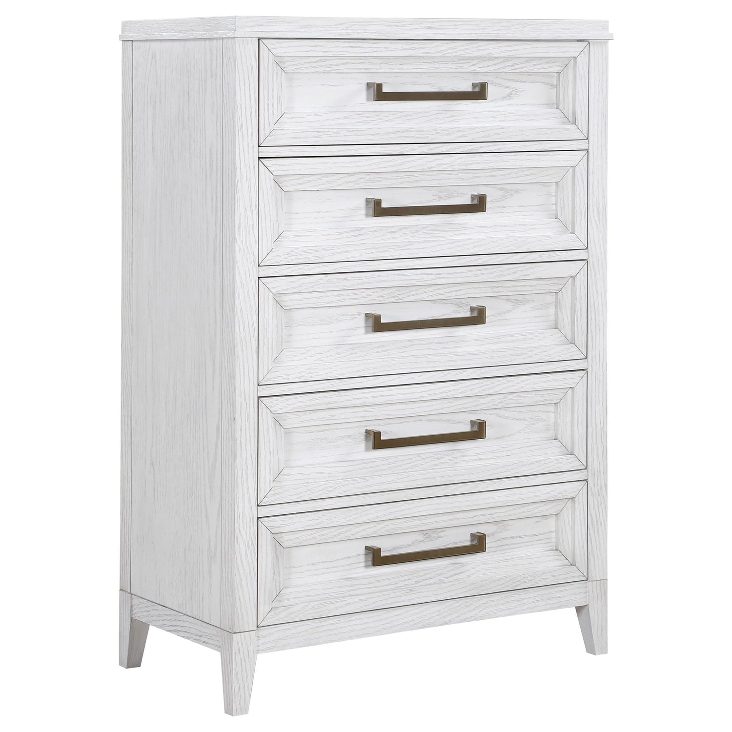 Add easy storage and inviting style to your bedroom with a modern five-drawer chest. It's tall, compact silhouette conserves space while adding welcome storage and organization. The chest features a distressed white finish to highlight wood grain details for a fresh, organic effect in your bedroom. Antique brass-toned bar pulls add contrast and definition on trimmed drawer fronts, creating inviting texture and depth. Tapered legs finish off this inviting look and a tip over restraint is included for added safety.