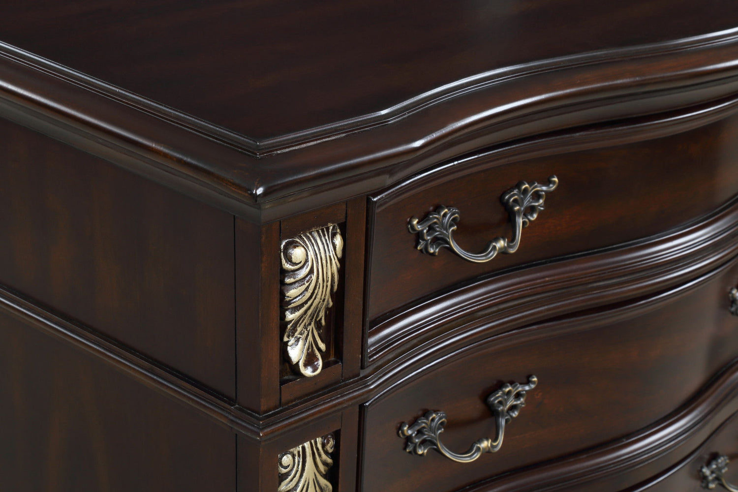 The Royal Classics Maximus 6-Drawer Chest in Madeira Brown is a masterfully crafted piece that blends enduring quality with timeless elegance. Constructed from solid poplar and premium birch veneers, this chest is built to last, offering heirloom-quality durability and beauty for years to come. The multi-step finish enhances the rich, natural grain of the wood, while delicately burnished gold tipping highlights the intricate Baroque-inspired carvings, adding a luxurious touch to the overall design. Each drawer is crafted with French and English dovetail joinery for exceptional strength and glides smoothly on full-extension tracks, providing effortless access to your belongings. The impeccably finished interiors ensure snag-free storage, while the velvet-lined top drawers add a layer of refined sophistication. This chest combines classic design with modern functionality, making it a perfect addition to any elegant bedroom.