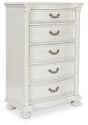 Montelaine - Five Drawer Chest - Antique White is backordered and will ship as soon as it is back in stock.