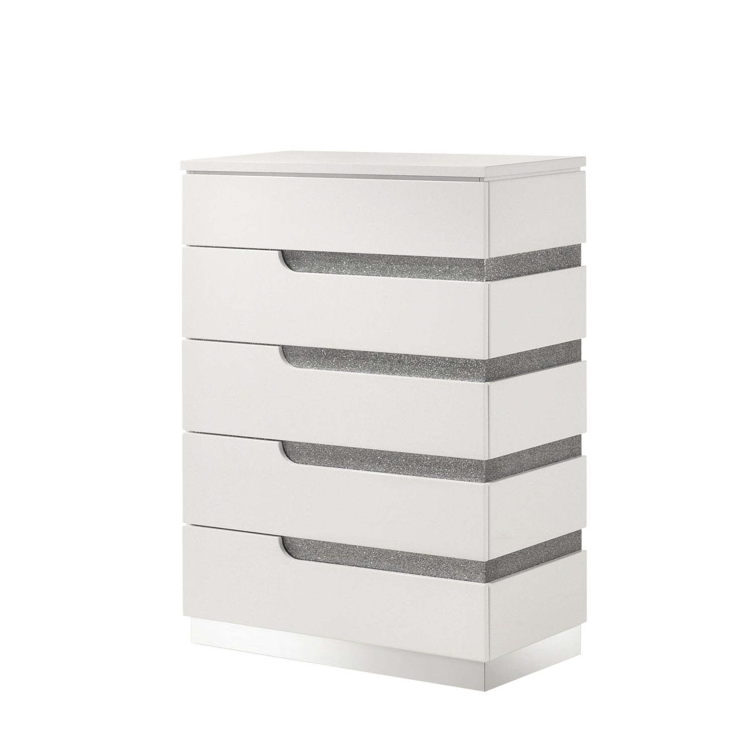 The Paradox Five Drawer Chest combines modern elegance with practical functionality. The gleaming gloss laminate finish offers a sleek, contemporary look while providing scratch and water resistance. Constructed from a combination of solid and manufactured woods, this chest ensures lasting durability. The fully finished drawers offer snag-free storage and glide effortlessly on full-extension, ball-bearing drawer slides. The show-stopping design, featuring a modern finish and glittering mylar inlays, transforms your bedroom into a high-style retreat. With five spacious drawers, this chest provides ample storage space for all your clothing, making it an essential and stylish addition to any bedroom.