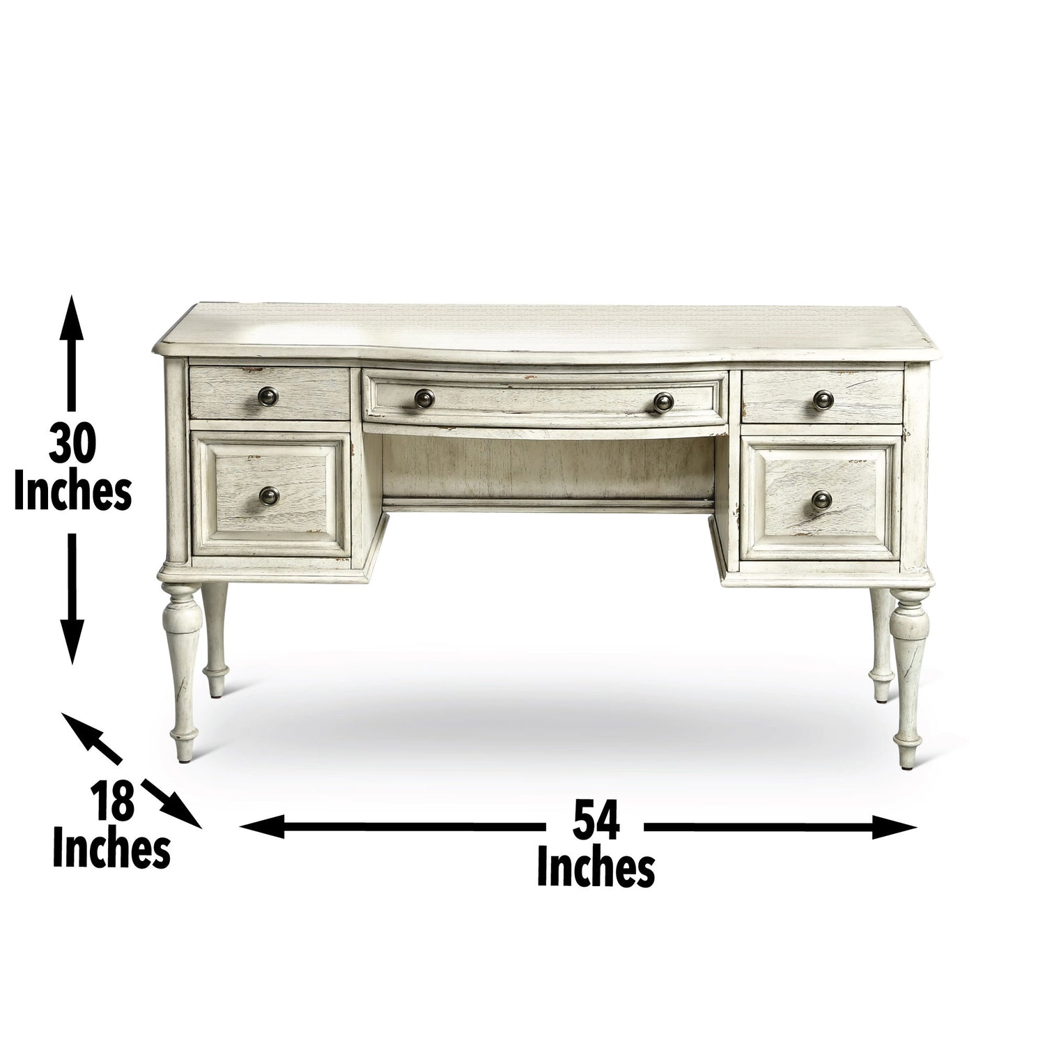 Highland Park features vintage styling in a classical bedroom collection. Sturdy construction using hardwood solids and veneers in a distressed rustic finish. Enjoy the vintage farmhouse style vanity that comes complete with gorgeous arched, hinged mirror and comfortable stool with padded fabric seat. Five drawers for convenient storage are accented by soft pewter knobs and beautifully turned legs.