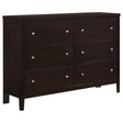 A perfectly designed dresser adds impressive character to any bedroom. This simple but classy wood dresser from the Carlton collection is a showcase piece of any master bedroom. It's impressively sized and expertly constructed with six wide drawers that hold everything from undergarments and swimsuits to an extra fleece to take the edge off an unexpectedly chilly night. Wide, roomy top holds a large mirror and decorative pieces like a vase. Wrapped in a luxuriantly warm cappuccino for the perfect ambiance.