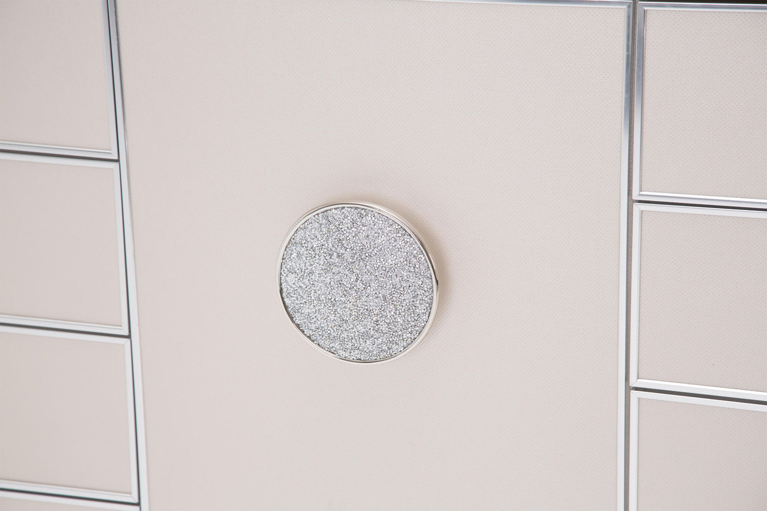 The dresser features a stainless steel medallion as the focal design element, with crushed crystallized facets. Drawers are framed with stainless steel and the piece is fully upholstered with high quality textured vinyl.