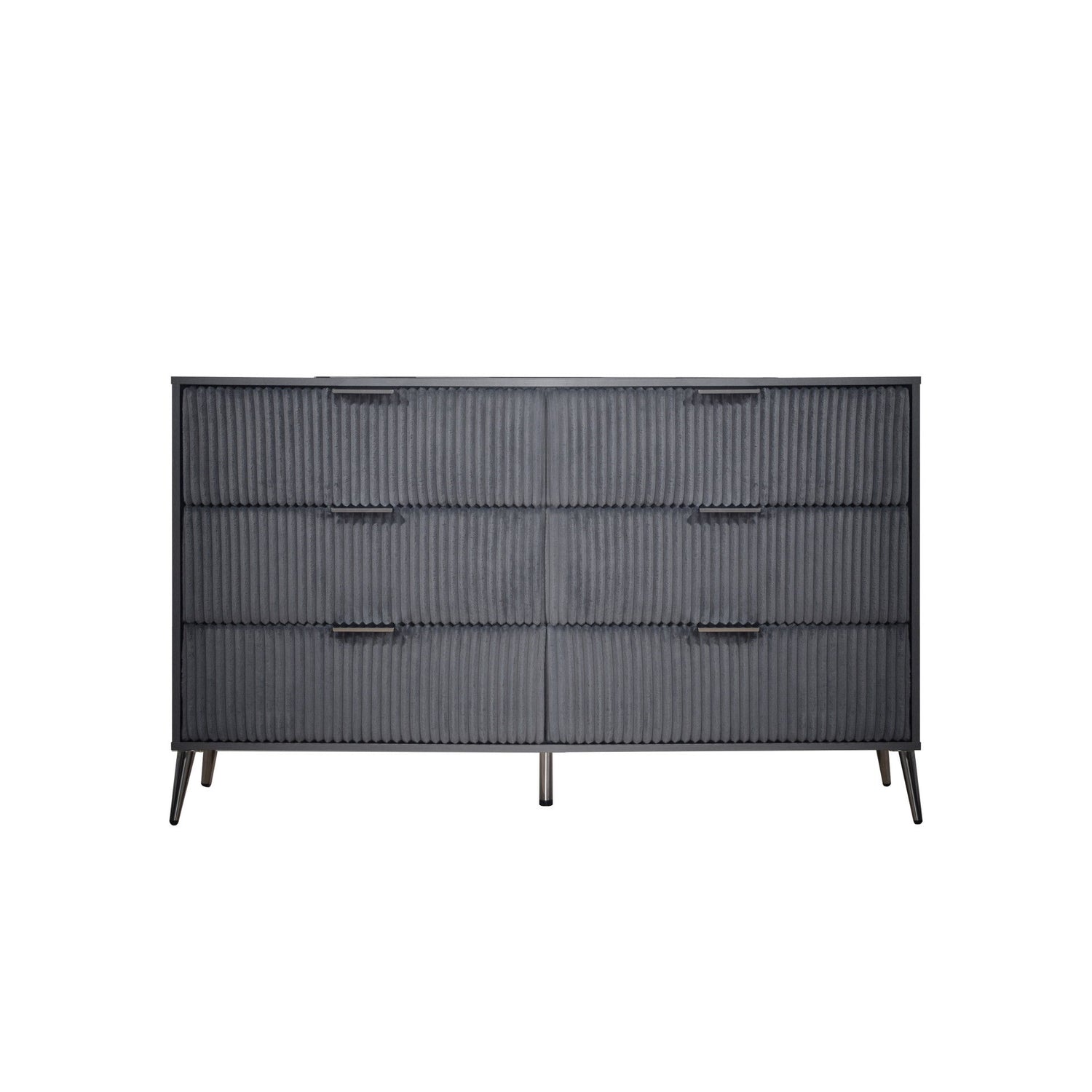 The Kailani 6 Drawer Dresser combines modern minimalist design with durable, eco-friendly construction, making it a stylish and sustainable choice for any bedroom. Crafted from solid rubberwood, engineered wood, and eco-friendly decorative laminate, this dresser is built to last with resistance to scratches, moisture, and stains, ensuring long-term beauty with minimal upkeep. The dresser features clean lines, a sleek silhouette, and a chic ribbed texture, complemented by slim metallic handles and tapered legs that enhance its contemporary appeal. Wrapped in luxurious 100% Polyester Velvet, the textured drawers are accented by chrome pulls and glide effortlessly on full-extension slides, with dovetail joinery providing lasting strength and smooth operation. This dresser not only adds a touch of sophisticated glamour to your space but also offers practical, snag-free storage, making it a perfect blend of form and function.