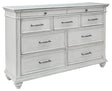 Made with veneers and select hardwood solids in a distressed whitewashed finish. Design features updated traditional styling with generously scaled moulding details. Dresser features 7 full sized drawers with 2 small scaled accessory drawers. Ball bearing side glides. Hardware has a transitional aesthetic and is finished in a dark gray pewter color. Mansion style headboard options feature a picture framed panel or inset tufted taupe upholstery cushion. Optional storage bench footboard.