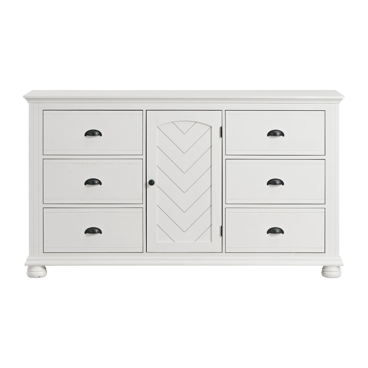 The Kona Dresser is a stylish and functional addition to any bedroom. It includes drawers and adjustable shelf cabinet storage. The chevron pattern detail on the cabinet door front adds a touch of elegance, while the black knob and cup pull hardware give it a modern look. The top drawers are lined with felt to protect your belongings, and the dust-proofing bottom layer ensures that your items stay clean. With Kenlin drawer guides, bun feet for stability, and an included anti-tipping kit for safety, the Kona Dresser is both practical and chic.