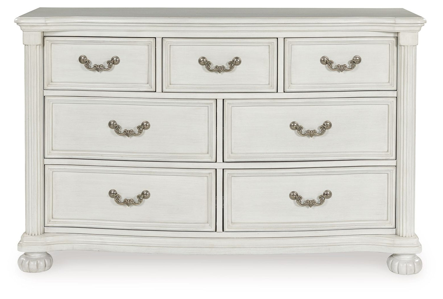 Transform your inner sanctum into a haven of timeless elegance and functionality. This traditionally styled dresser is adorned in a classic antiqued white finish, highlighted by a serpentine-shaped front with thick decorative moulding. Its drawers are packed with ample storage possibilities. And did we mention the stylish reeded bun feet? Talk about relaxed refinement.