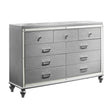 Discover the Valentino 9 Drawer Dresser—a marvel of durable craftsmanship crafted from a blend of manufactured and solid woods, adorned with exquisite embossed inlays. Radiating with glitz and glam, its gleaming finish, mirrored trims, crystal-studded drawer pulls, and alligator-embossed accents capture the essence of Hollywood allure. Delight in its thoughtful details, from heirloom-crafted English dovetailed drawers with snag-free interiors to smooth full-extension ball-bearing glides. With an abundance of storage, this dresser offers ample space to organize your clothing and belongings effortlessly. Experience luxury and functionality combined in this unparalleled piece of furniture.