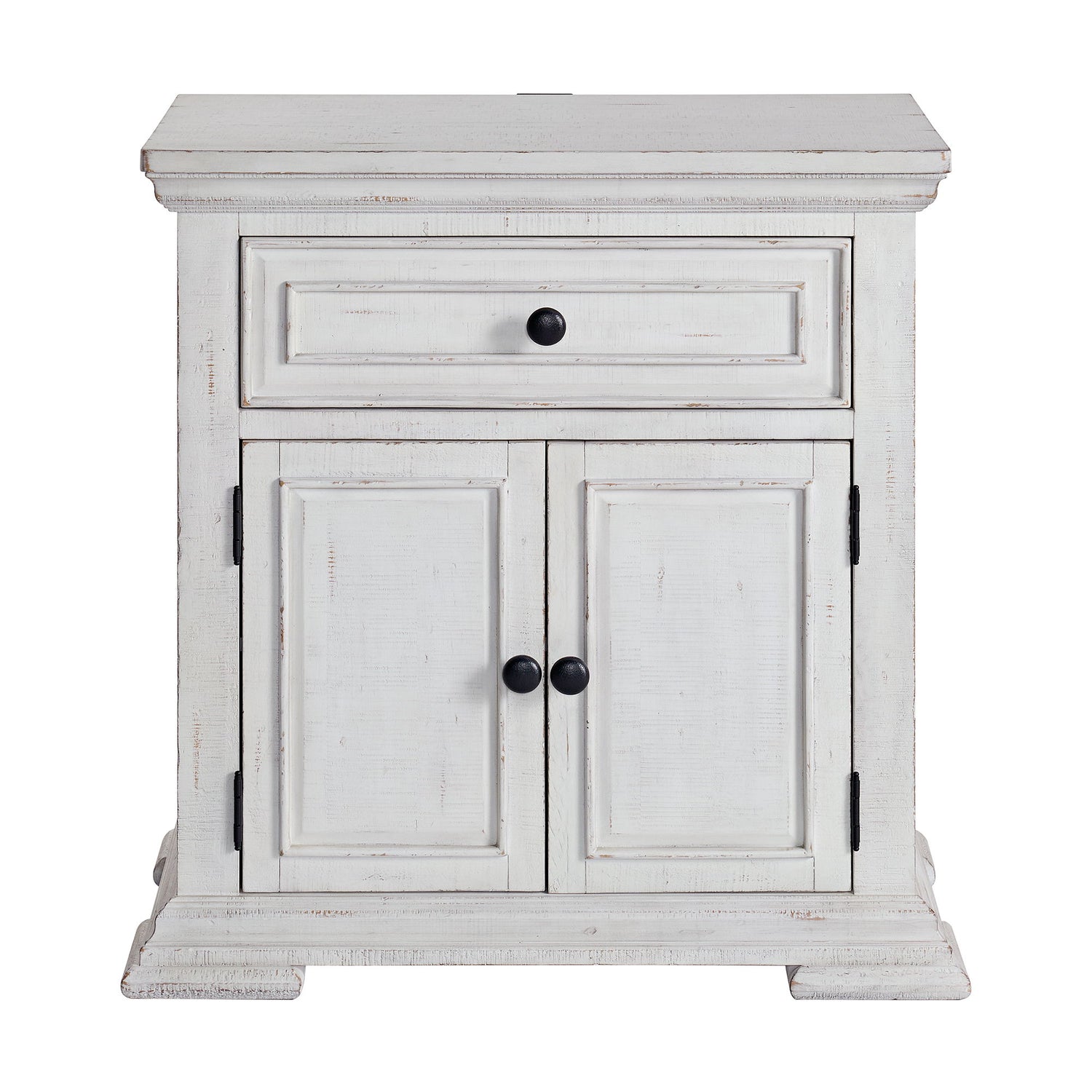 Accent your bedroom with the artistic style of the Heather 1-Drawer Nightstand with USB. Made with solid pine wood in an aged white finish, the sophisticated nature of this piece gracefully accents your space. A molded frame and beveled feet convey timeless, traditional style, while sleek, black drawer and cabinet knobs create a clean contrast. French and English dovetailing denote skillful drawer craftsmanship, while a conveniently integrated USB port allows you to easily charge electronics from your bedside. For an artistic and refined addition to your treasured space, choose the Heather 1-Drawer Nightstand's smart design.