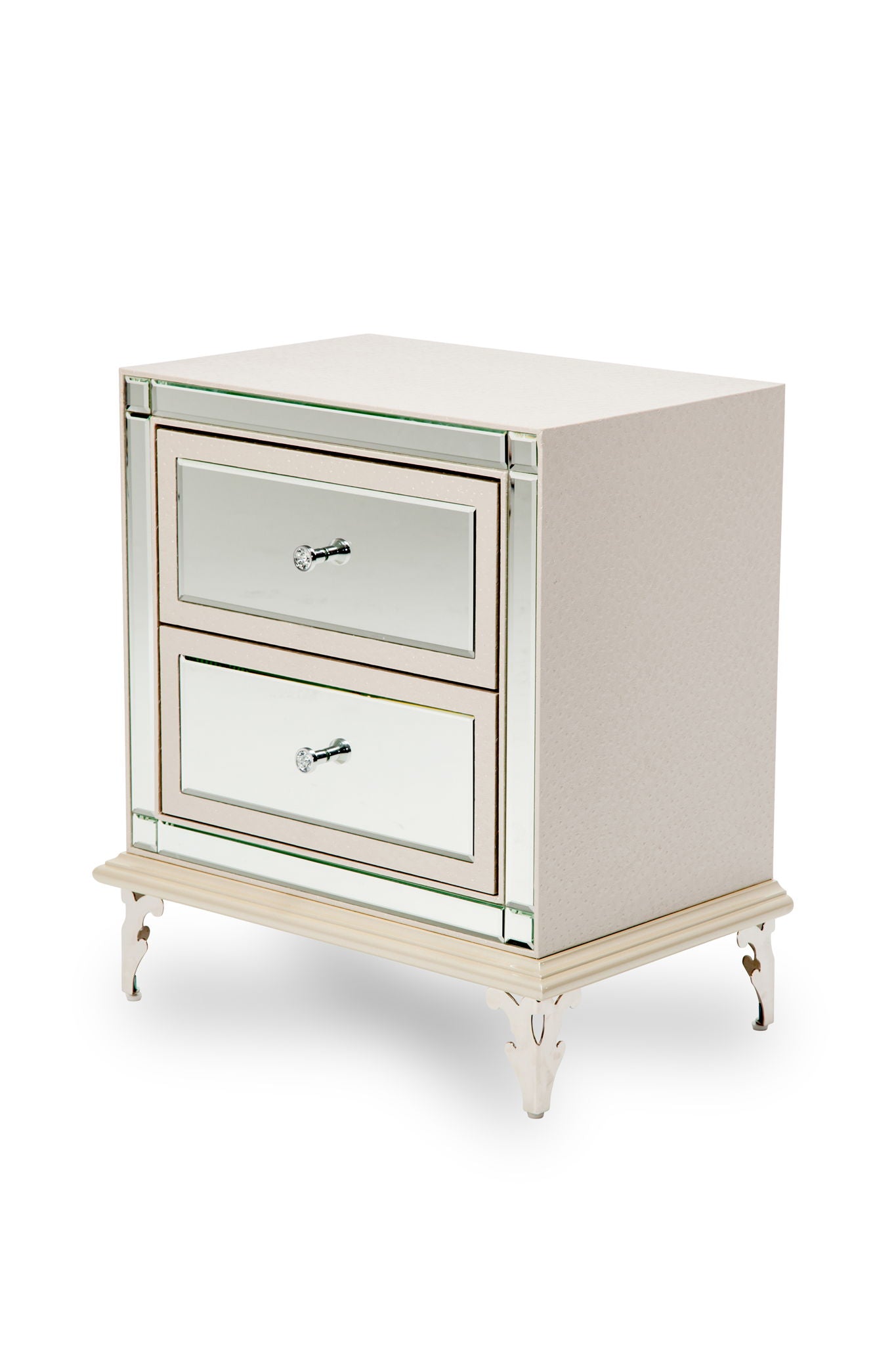 Simple elegance is the allure of this nightstand, featuring mirrored drawer fronts and chrome knobs with crystal inset. The piece is fully upholstered with high quality textured vinyl, and framed with beveled mirror glass for added visual appeal.