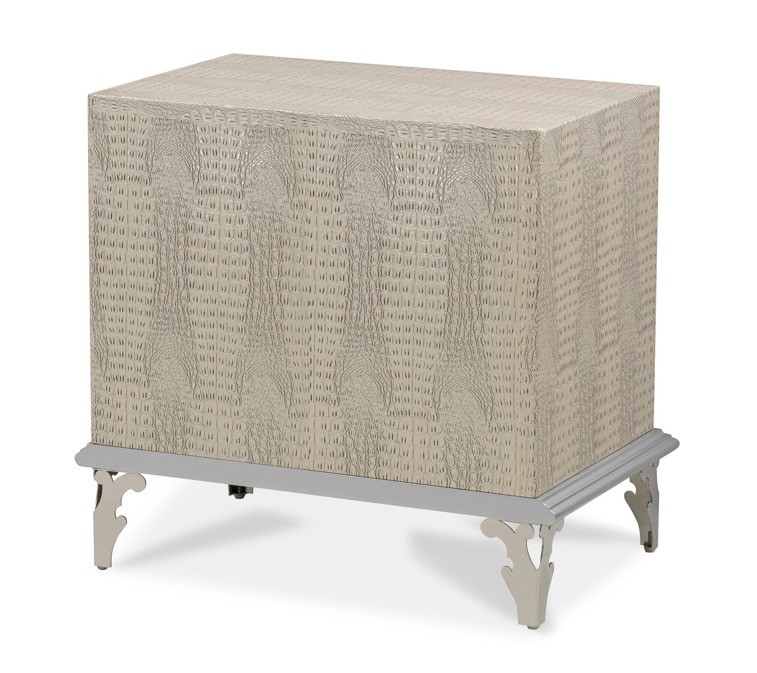 Picture yourself with the glamour and drama of this gorgeous nightstand. The high-quality Crystal Croc vinyl wrap creates an intriguing visual appeal beautifully adorned by the custom hardware in polished stainless steel and crystal.