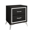 The Huxley 2-Drawer Nightstand offers a blend of contemporary glam and durable construction for your bedroom. This nightstand is carefully crafted from manufactured woods and eco-friendly decorative laminate, ensuring it will last for years. The design features clean lines with metallic accents and flared silver legs for a modern touch. Its rich finish provides a sleek, sophisticated look that is both timeless and modern, with bold highlighting the metallic accents and smooth surfaces for a chic, polished aesthetic. The quality drawer construction includes English dovetail joinery and smooth-rolling center glides for long-lasting operation. Functional and fashionable, this nightstand provides ample storage for bedside essentials, with chic, crystal-studded drawer pulls for easy access.