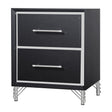 The Ava 2 Drawer Nightstand in Ebony blends modern glamour with everyday functionality. Crafted from engineered wood with eco-friendly black laminate, it features silver mylar accents and sculpted legs for a chic finish. Two spacious drawers offer smooth operation with English dovetail joinery and Kenlin ball-bearing glides. A stylish and practical piece that adds a touch of sophistication to any bedroom.