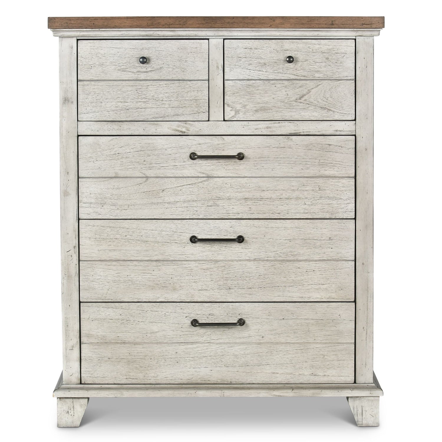 Bear Creek, a rustic, farmhouse-inspired bedroom collection, features a rustic chocolate finish that contrasts beautifully with honey-stained tops and cap rails. The Bear Creek Five Drawer Chest offers spacious storage with ultra-deep drawers supported by side drawer glides for easy operation. Your purchase includes one chest.
