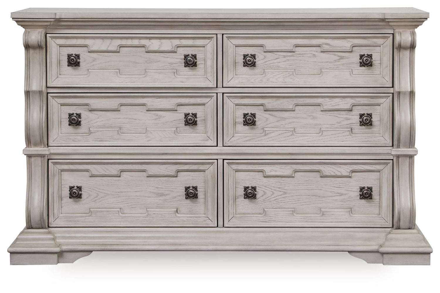 Inspired by the grandeur and grace of European traditional style, this opulent dresser is nothing short of stunning. Its large-scale decorative scrolled pilasters, along with an ash swirl border and walnut inlay crowning the top, are sure to make a sophisticated statement in your restful retreat. A timeless antiqued white coloration and bronze-tone drawer pulls lend an air of subtle elegance to this sumptuous piece.
