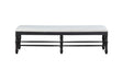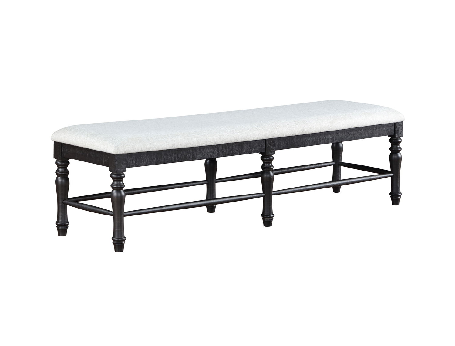 Featuring a sleek black finish over solid Asian hardwoods, the Odessa Bench is a modern interpretation of a classic farmhouse style. The 65.5-inch bench is made from solid Asian hardwoods and can accommodate three adults comfortably., ts solid wood turned legs, generously supported with stretchers to ensure stability and longevity. The fully cushioned seat, adorned with easy-care white polyester fabric, offers both comfort and a striking black-and-white contrast, adding a contemporary touch to your decor. Accent your home with the timeless elegance of the Odessa Bench, where tradition meets the present.