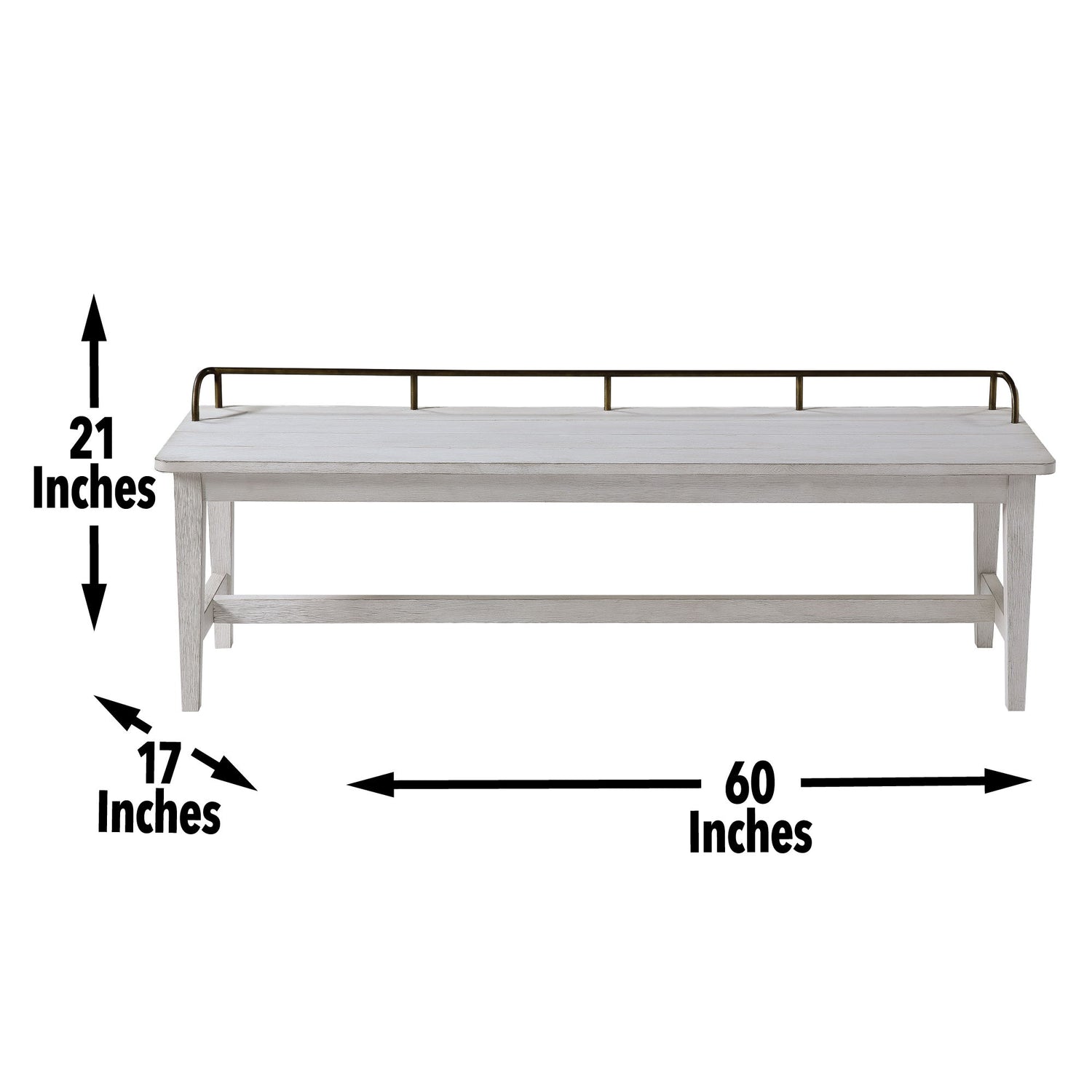 A Bench constructed of Asian Hardwood solids and built to last, the Pendleton Bench features a lustrous Ivory finish and oil-rubbed brass finish galley rail for a charming farmhouse look to blend with any casual decor. Great for seating multiple guests at the Pendleton table or as a bench in a mud-room or at end of bed.