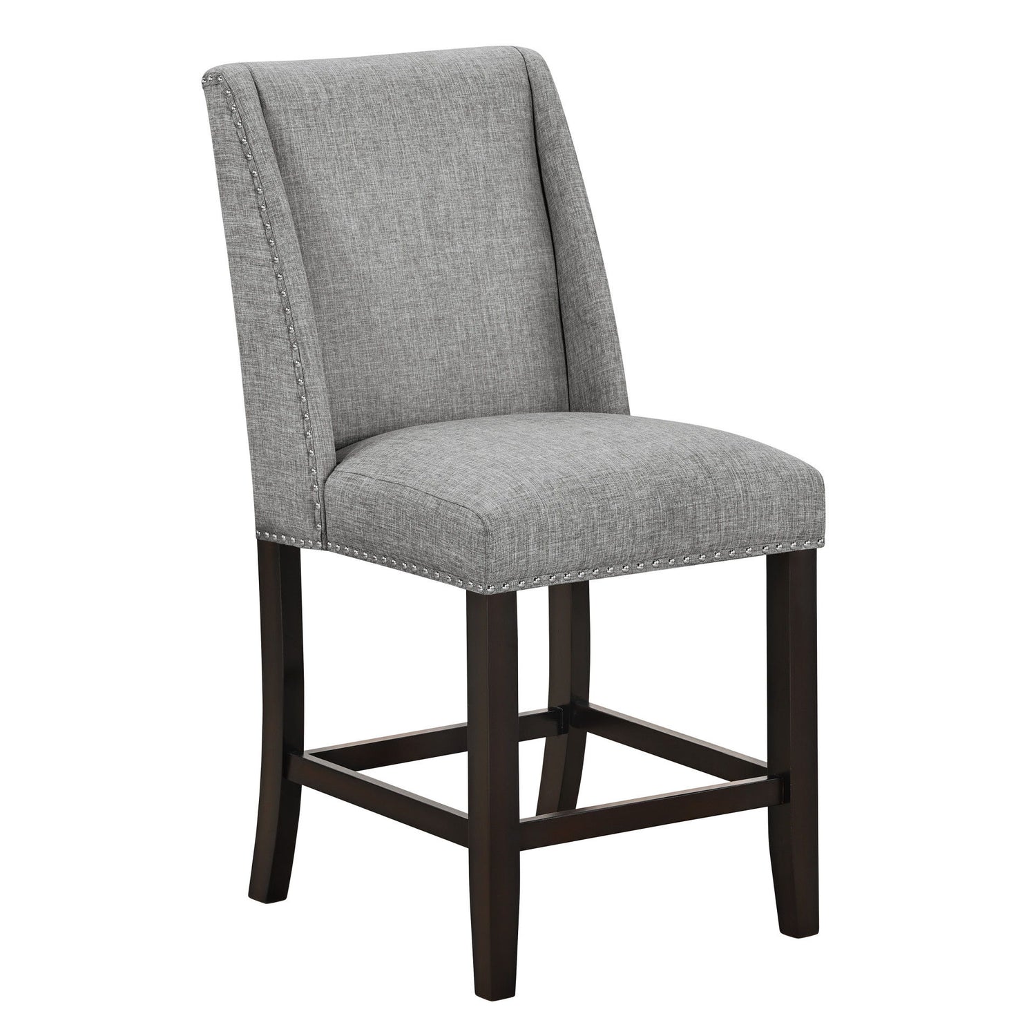 The Faust Upholstered Parsons Counter Dining Chairs offer a blend of luxury and durability, making them an excellent addition to any dining space. This set includes two Parsons counter chairs, each crafted from solid rubberwood and eco-friendly manufactured woods to ensure strength and durability. The solid wood legs and base stretchers provide extra stability, making these chairs a reliable choice. The 100% polyester tweed fabric fully upholsters the chairs, offering a soft, comfortable, and easy-to-clean surface. Featuring a sleek, contemporary design, the chairs are enhanced with decorative nailhead trim along the edges, adding a touch of elegance and sophistication. The dark wooden legs create a striking contrast to the light gray upholstery, resulting in a balanced and modern aesthetic. Ideal for those seeking a combination of style, comfort, and durability, the Faust Parsons Counter Dining Chairs are perfect for elevating your dining area.