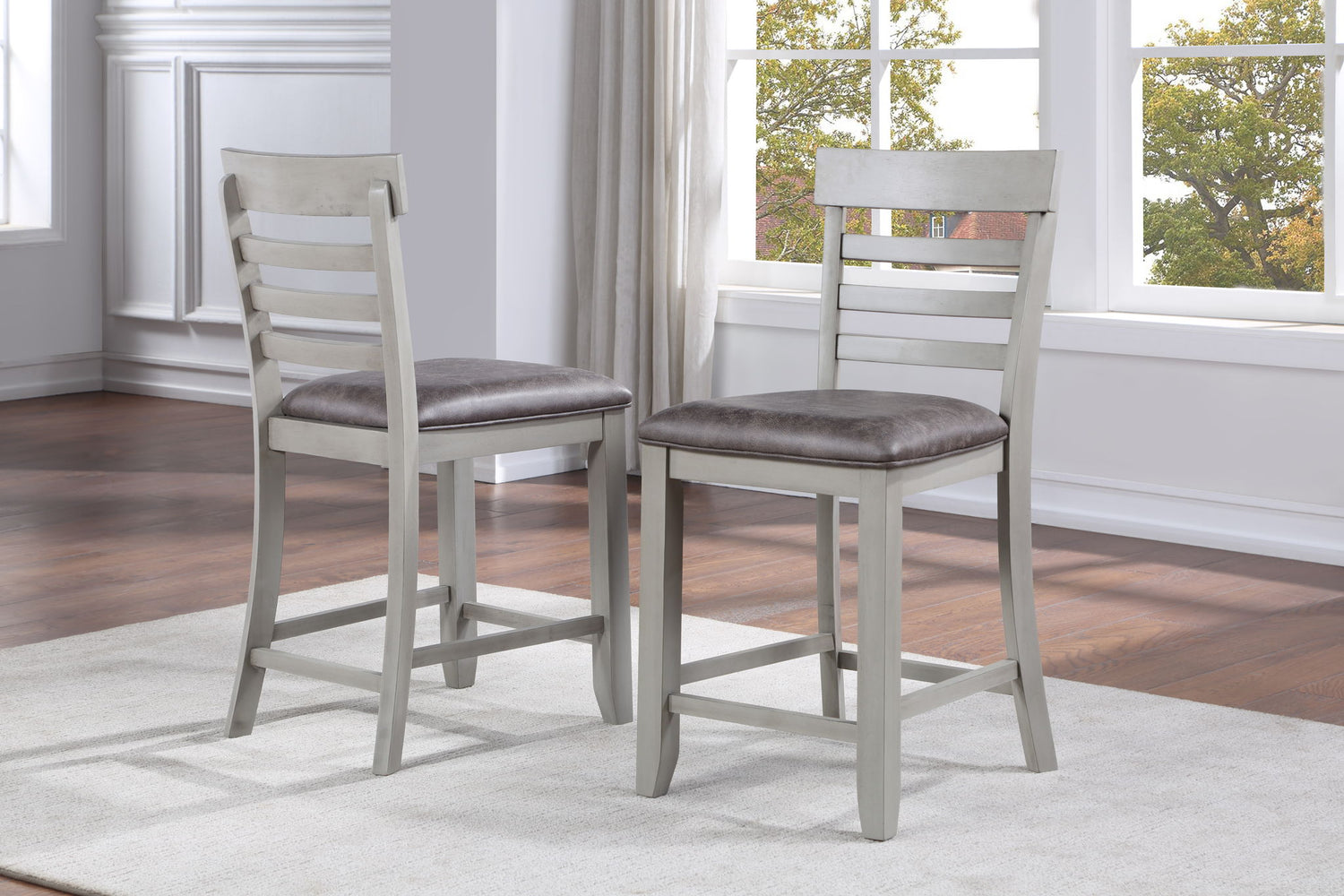 An upholstered Counter Chair that sports a stone gray finish and vegan rawhide seat to make a stylish and comfortable addition to any kitchen or dining area. The horizontal slatback design features a shaped top rail for a relaxed transitional appeal. Stretchers add structural support and a place to rest your feet when seated at the Hyland Counter Table or a Counter Bar.