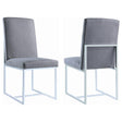 Elevate your dining space with this sleek and modern dining side chair, designed to blend style and comfort effortlessly. The chair features soft upholstery with a padded seat and backrest, providing a cozy seating experience for meals or gatherings. Its open metal frame, finished in polished chrome, creates a minimalist silhouette that adds a touch of contemporary elegance to any room. Perfect for both casual and formal dining settings, this chair complements a variety of decor styles, from modern to minimalist. Enhance your dining area with a chair that brings both visual appeal and functional design.