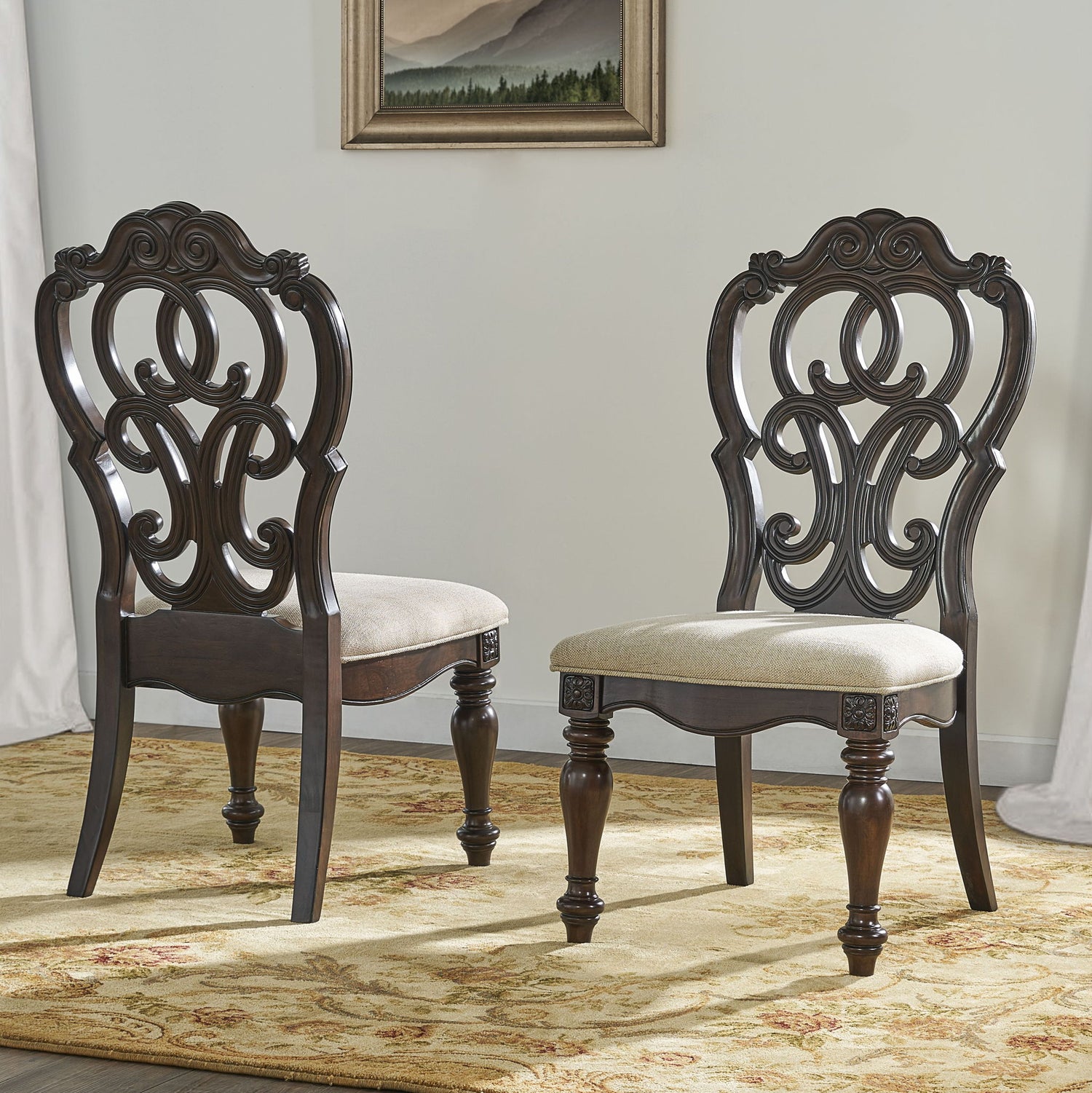 Royale evokes memories of the detail and craftsmanship of yesterday's antiques in a dining collection updated for today. The Royale Side Chair boasts a warm, brown pecan-colored finish with an elaborate shaped back inset with a cascading medallion. The comfortable seat is upholstered in a beige 100% polyester fabric that is easy to clean.