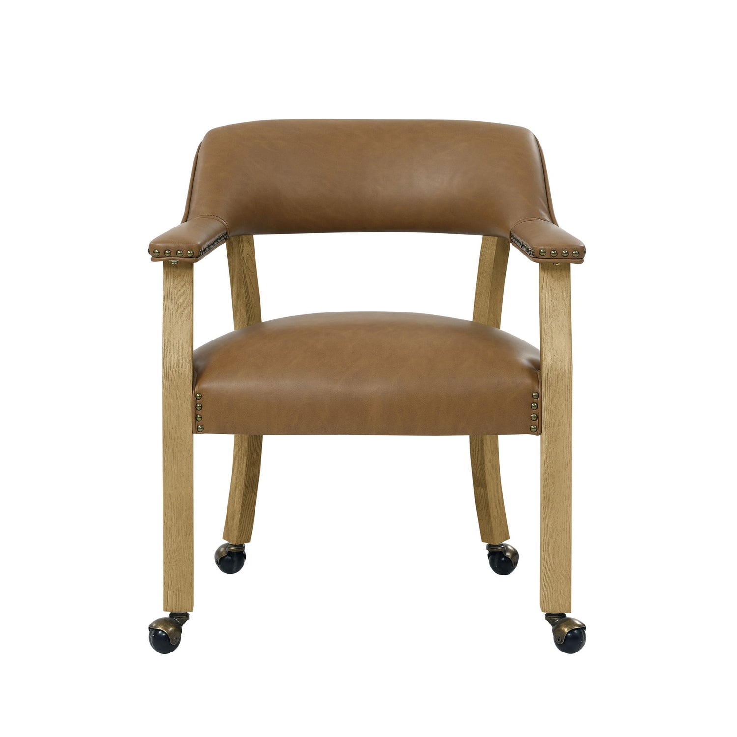 The Rylie Captain’s Chair effortlessly combines practicality and elegance. Outfitted with four independent casters, it offers unparalleled mobility, ideal for dining rooms, offices, or as a sophisticated addition to living spaces. Its solid wood legs guarantee both durability and stability. Wrapped in fade-resistant camel vegan leather and adorned with copper nailhead trim, this chair radiates lasting beauty. The natural, light finish highlights the wood’s intricate grain, creating a fashion-forward appearance.