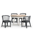 This table and four chair dining set combines style and functionality. Bold contrasting black spindled barrel chairs pair beautifully with the round 48" table with its natural weathered finished top, creating a unique look to freshen your dining space.