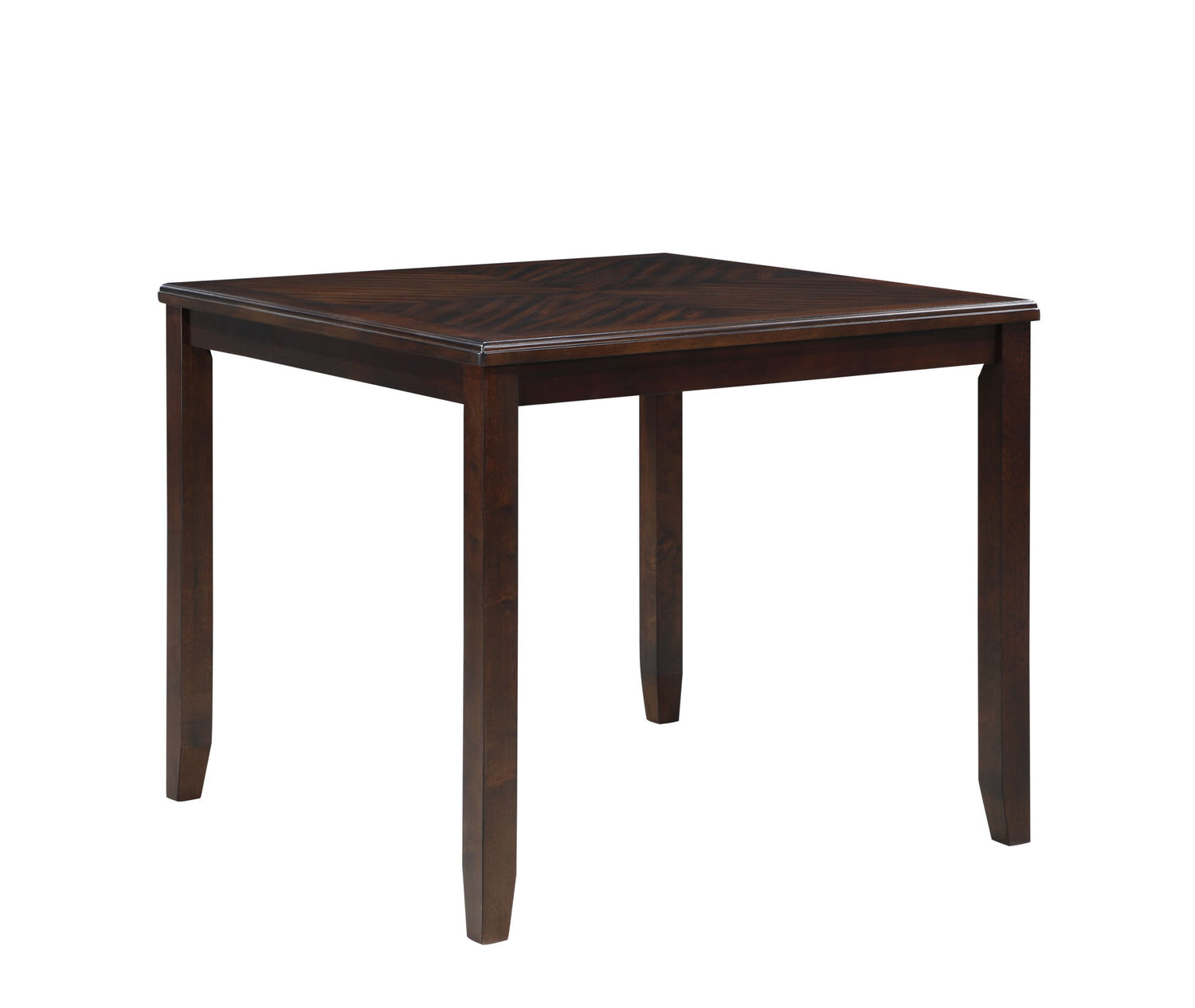 Complete your dining space with the New Classic Furniture Gia Wood Square Counter Dining Set, a harmonious blend of durability and beauty. Crafted from solid Rubberwood and Mindi veneers, this set is designed to withstand the test of time. The traditional finish, achieved through a meticulous multistep process, enhances the natural grain of the wood. The spacious 42-inch square counter table comfortably accommodates four, making it an ideal setting for intimate gatherings. The chairs, with 100% polyester upholstered cushions, are supported by solid wood legs reinforced with four base stretchers, doubling as footrests for added stability. The distinctive design includes a fancy face reverse diamond veneer dining tabletop, interlocking chain chair back detail, and tapered legs. Assembly is easy with all necessary hardware and clear instructions included. Backed by a one-year warranty, this Gia Dining Set offers both practicality and style for your dining area. Invest in quality and enjoy timeless design with this functional dining set.