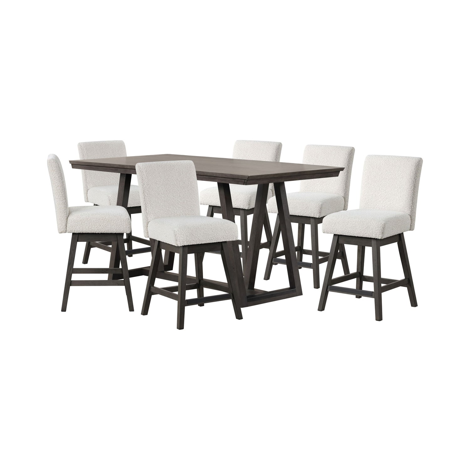 The High Line Counter Dining Set is the perfect blend of style, durability, and comfort for your home. Expertly crafted from solid Acacia and Rubberwood, along with high-quality manufactured woods and Birch veneers, this set guarantees durability and stability for long-term use. The fresh, contemporary finish features a meticulously hand-applied, multi-step process, resulting in a smooth, matte hue with sophisticated undertones. This finish, combined with subtle wood grain patterns, creates a sleek and modern ambiance, ideal for contemporary spaces. The chairs are upholstered in luxurious bouclé fabric, known for its exceptional durability and plush comfort, making them perfect for frequent use. The unique looped texture adds an element of elegance and ensures the longevity of your seating. The table''s flat, rectangular top and crisscross leg design emphasize functionality and simplicity while adding visual interest and stability, making it a versatile addition to any room, from dining areas to workspaces. This set comfortably seats up to six guests, with the spacious table and comfy chairs upholstered in 100% easy-care polyester fabric, blending elegance with practicality. The High Line Counter Dining Set offers a stylish, functional, and durable solution for your dining needs.