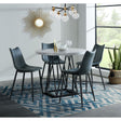 The Riko 5PC Counter Height Dining Set is a beautiful set for your dining room. The rounded shape of the white, marble table top transitions into sleek, clean lines and a square pedestal base. The veining in the marble table top will slightly differ with each cut but makes this piece so unique. Why stop there, when the counter height side chairs provide a completed look to this set. The chairs, are designed with faux leather bucket seating and purposeful distressing in the fabric. The rugged look of the chairs and the cleanliness of the marble table top give this set a transitional design your dining room needs.