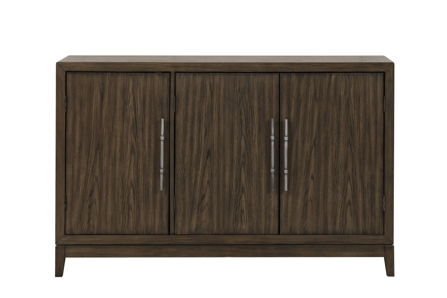 The Cityscape Dining Server / Buffet offers both style and practicality, making it an ideal addition to your dining room. Crafted from a blend of resilient Rubberwood solids, manufactured woods, and real Oak veneers, this sideboard showcases the natural beauty of wood while ensuring long-lasting durability. The sleek lines and dark walnut finish give it a modern, industrial-inspired aesthetic that fits seamlessly into a variety of décor styles. Behind the cabinet doors, you'll find two large drawers perfect for storing linens and flatware, along with spacious open shelving designed to hold china and larger dining essentials. This server provides ample storage while maintaining a refined and sophisticated look, perfect for any dining space.