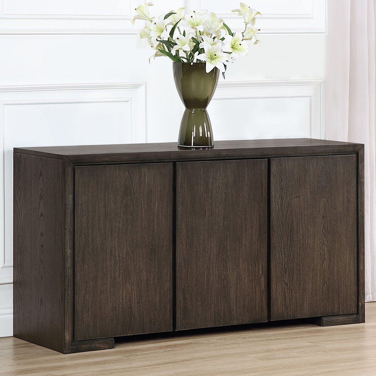 The Evan 60" Server combines sleek modern design with versatile functionality. Expertly crafted from oak and mango veneers, solid Asian hardwoods, and engineered woods, it features clean lines and a hand-stained walnut finish that highlights the wood’s natural grain. Three adjustable shelves offer flexible storage, while soft-touch doors and concealed European hinges provide a seamless, hardware-free look. Plastic glides protect floors from scratches. With its minimalist design and practical storage, the Evan Server is the perfect addition to any modern dining or living space.
