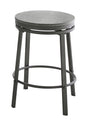 Mixed media counter set with compact design and stylish gray finish. Portland features swivel counter stools with stretchers for added strength and comfort and the round dining table fits well in any dining setting.