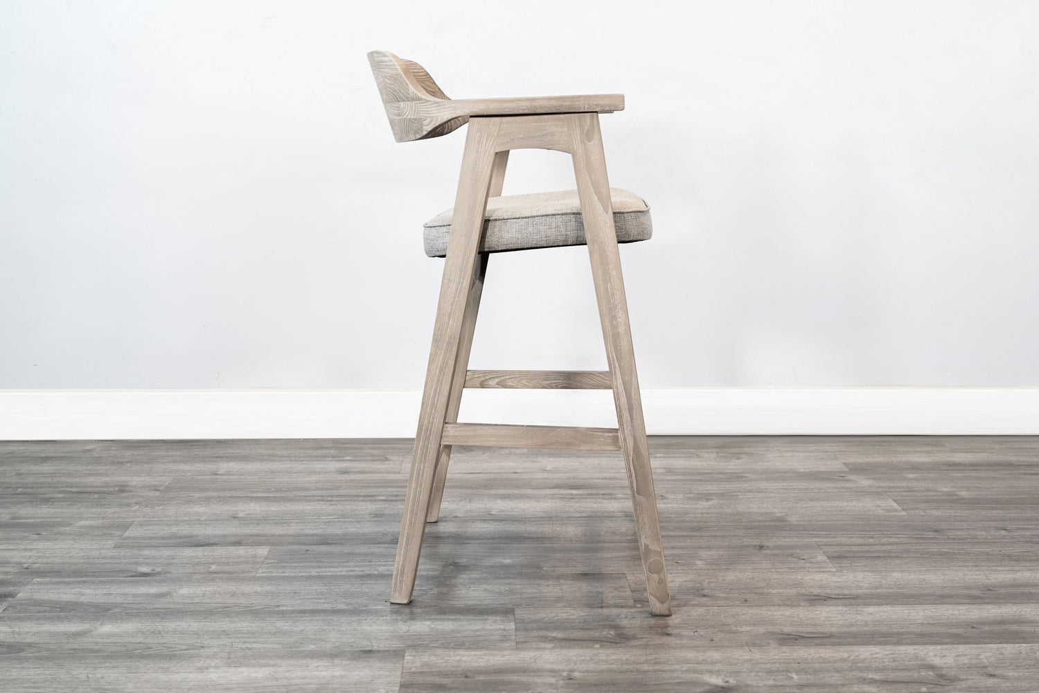 A sleek fusion of form and function, this solid wood bar height arm chair brings mid-century modern charm to any dining or accent space. The sculpted frame and low-profile arms offer a refined silhouette, while the padded seat cushion provides everyday comfort. Crafted from solid wood with visible grain detailing, this piece is perfect for bar height counters or tables.