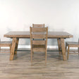 This dining set was designed with mahogany solids. Distressed metal turnbuckle accent for table and bench base. The table comes with two 15” extension leaves for additional seating and the buffet delivers all storage Needed.