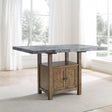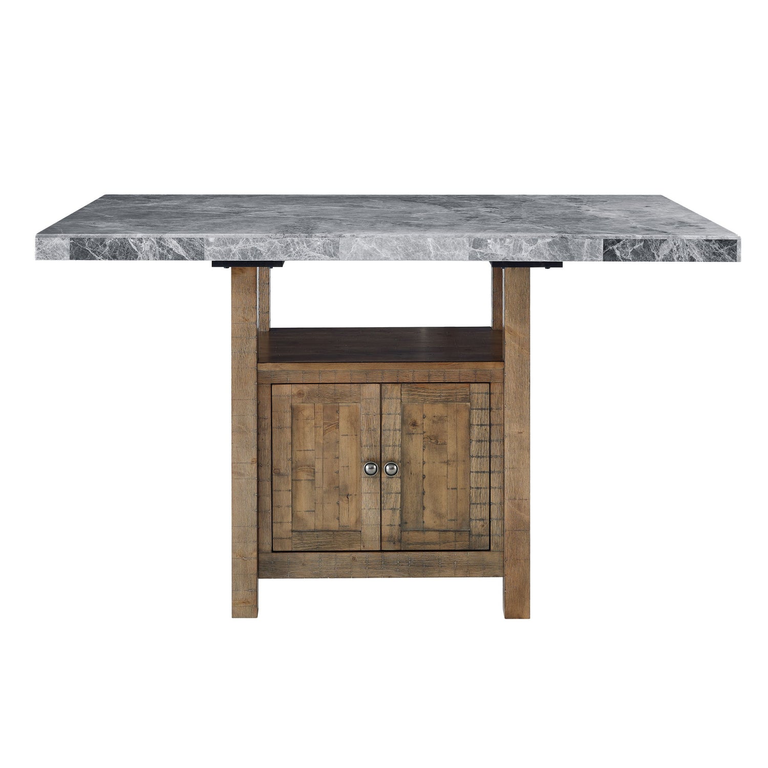 Refined rustic styling brings in an elegantly casual Storage Counter Dining Table. A beautiful gray marble top pairs beautifully with a dusty honey finish in a style that is good for both everyday and special event dining. The Counter Table offers valuable storage in the base for placemats, silverware or other items. The 60 inch table accommodates six comfortably using the available Counter Chairs and/or Counter Bench.