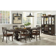 Update your space with the stylish Jameson dining room collection. This formal group combines the look of rich espresso with the understated styling of traditional design. Brown undertones play to the look of the rectangular dining table with removable leaf. The trestle base with double pedestals add perfectly to the table’s trend forward style. Adding the hutch and buffet to complete its trend forward style.