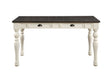 The Joanna Farmhouse Dining Table adds a beautiful dimension to any dining area. Measuring 59.5 inches in length, this table comfortably seats six and is ideal for medium-sized dining rooms. Expertly crafted with high-quality materials, the Joanna Farmhouse Dining Table boasts a wire-brushed ivory and mocha finish that enhances its rustic charm. Its turned legs add to its elegant design, while the four working felt-lined drawers provide ample storage for your dining essentials. Functional and stylish, this dining table is perfect for hosting dinner parties or family gatherings. Its unique texture adds depth and character to the wood, making it a standout piece in any dining area. Experience the perfect blend of style and functionality with the Joanna Table. Its solid construction, elegant turned legs, and convenient felt-lined drawers make it a durable and sophisticated choice for any home.