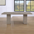 Elegance and functionality fuse together in the Lily 60-78″ Dining Table. Crafted from ash veneers with solid acacia and mango wood, the contemporary table boasts a horizontal reeded base treatment in a Greige finish. At a comfortable 30 inches tall, the double pedestal construction offers stability and ample chair clearance. The table goes from intimate to inclusive with the 18-inch leaf expanding the table from 60 to 78 inches to seat eight guests. The crisp lines and clean design create the perfect modern dining room centerpiece.