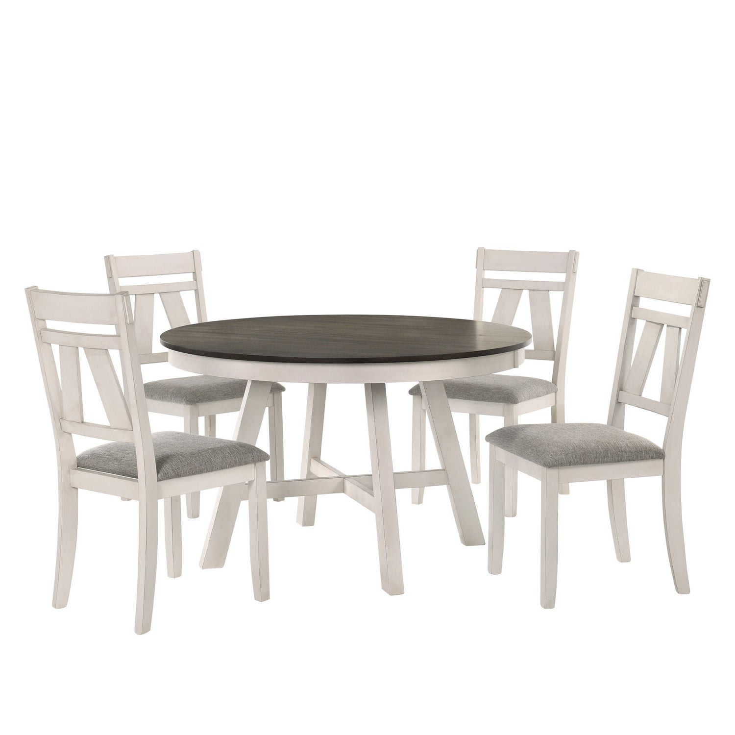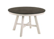 The Maisie Round Wood Two-Tone Dining Table is an ideal blend of quality construction and welcoming rustic charm, perfect for any dining space. This table is crafted from solid rubberwood, manufactured woods, and Mindy wood veneers, ensuring a sturdy and long-lasting addition to your home. The table features a dark brown tabletop with a smooth finish, creating a striking contrast to the rustic white, slightly distressed base, enhancing its farmhouse appeal. Perfect for small space dining, this round table comfortably seats four, making it an excellent choice for intimate settings, kitchen spaces, or dining rooms. The Maisie Dining Table seamlessly combines the warmth and texture of rustic elements with the sleek, clean lines of modern design, creating a dining space that feels both fresh and timeless. This table is a practical and stylish choice, perfect for making every meal a delightful experience.